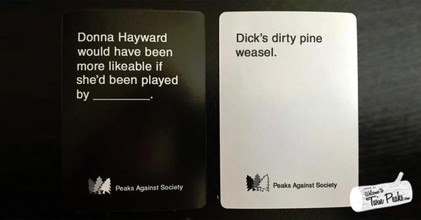 There is now an unofficial fan made expansion of Cards Against Humanity called Peaks Against Society which includes 36 new cards that you can include in your next Card Against Humanity Game. There are some great cards in this set which represent some of the most iconic lines from Twin Peaks, one example is “Harry, I’m going to let you in on a little secret.