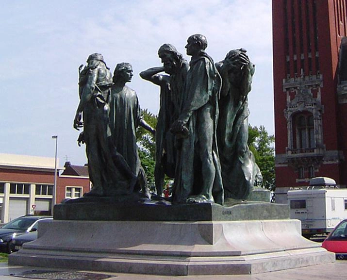 The piece includes six human statues, and depicts a war account during which six French citizens from Calais were ordered by monarch Edward III of England to abandon their home and surrender themselves—barefoot and bareheaded, wearing ropes around their necks and holding the keys to the town and the caste in their hands— to the king who was to order their execution thereafter.