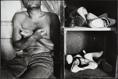 The shoes take on a significance because of their displacement. Cast off and ordinary, in the context of this image, juxtaposed with the male torso, there is no logic to their inclusion in the composition.