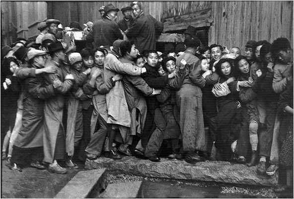 The photo was taken just before ten lives were lost in suffocating crush; Cartier-Bresson succinctly captured the claustrophobic character of the image.