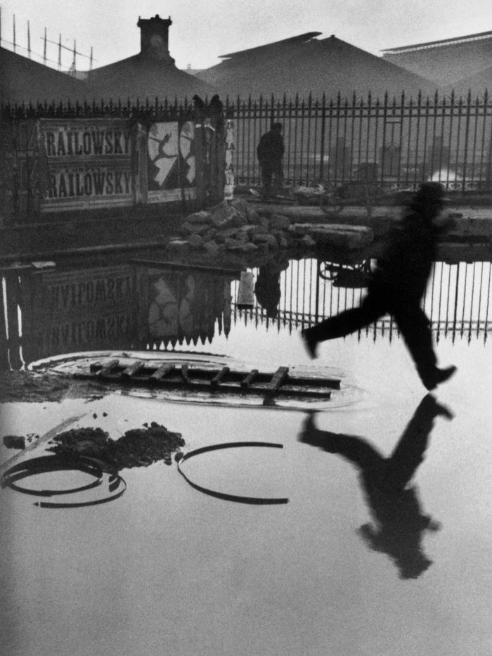One of the most successful image by Cartiert-Bresson from this period is Plase de l’Europe (1932.) The snapshot of a man gleefully hopping over a flooded area in Paris catches the moment just before the man’s heel hits the water.