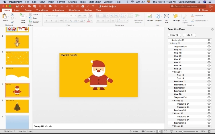So in the snow slides you can see I get to select the elements, edit them (make them bigger, taller, larger, change colors, shadows, dimension, glow, position…), animate them…There’s the Santa model which is more recent.