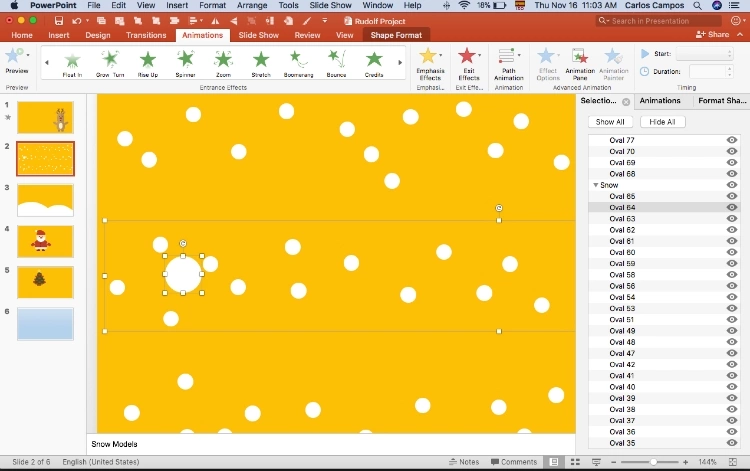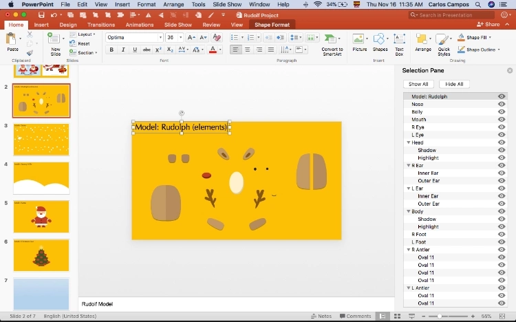 Carlos: Exactly. Anyway, as you can see in the “Model: Rudolph (elements)” slide, I create a bunch of shapes and then put them together to create the actual model which will then be animated.