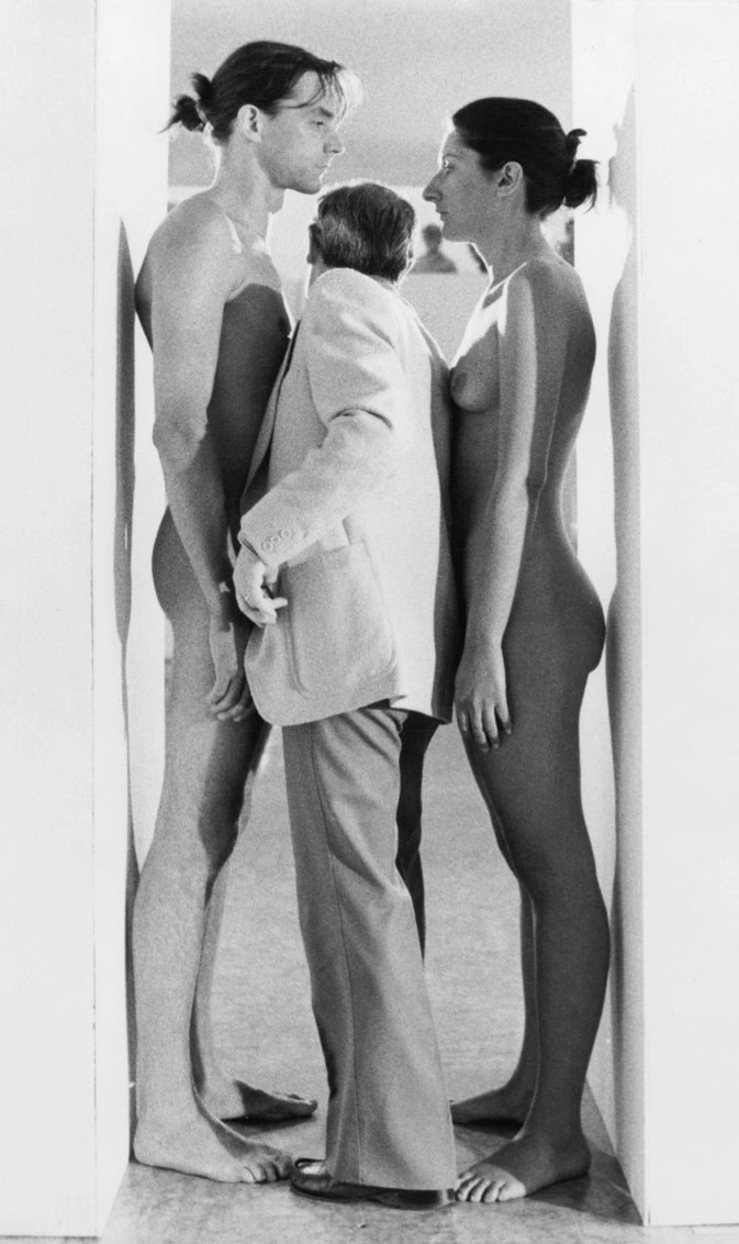 They performed their works in gallery spaces, mostly in Europe; some of their best known works included Imponderabilia, from 1977; it included a naked couple planted like caryatids on either side of a narrow doorway at the entrance to a gallery, they backs to a frame.