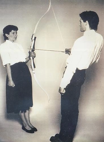 Ulay and Abramovic faced each other, aiming an arrow a tense bow, just inches from her heart. They placed small microphones on their chests in order to make audible their increasingly rapid heartbeats in response to the growing danger.
