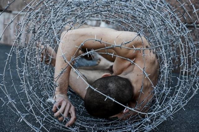 Carcass (2013) saw Pavlensky wrapped naked in barbed wire outside the Legislative Assembly of St. Petersburg, protesting the legal and social repression of individuals who fall outside state-approved norms. Fixation (2013) remains his most iconic action: sitting naked on Red Square, Pavlensky nailed his scrotum to the cobblestones on Russia's Police Day, creating an image of literal attachment to a state that brutalizes its citizens.