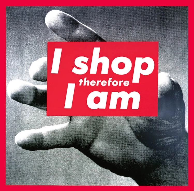 Key figures include Andy Warhol (pop art as postmodern gesture), Cindy Sherman (identity and representation), Jeff Koons (kitsch and commodity culture), Barbara Kruger (text-based critique), Damien Hirst (spectacle and mortality), and Gerhard Richter (painting across styles).