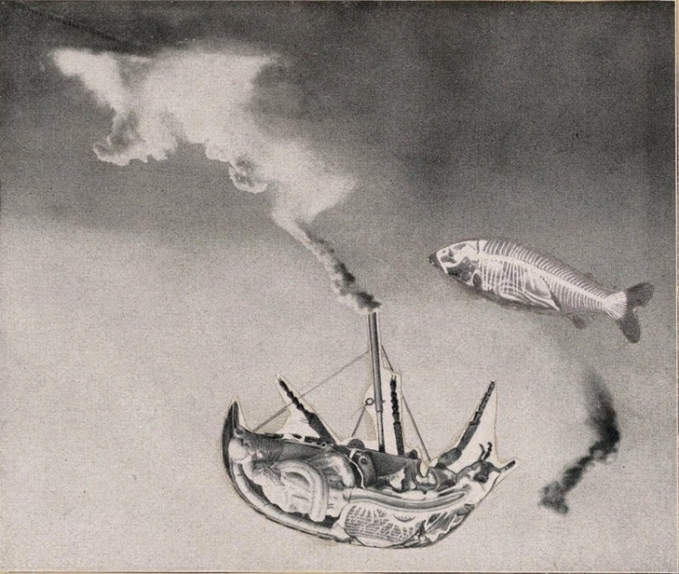 One of these compositions is Here everything is still floating (1920), a startlingly illogical composition made of cutout photographs of insects, fish and anatomical drawings ingeniously arranged to suggest the multiple identities of the things represented.